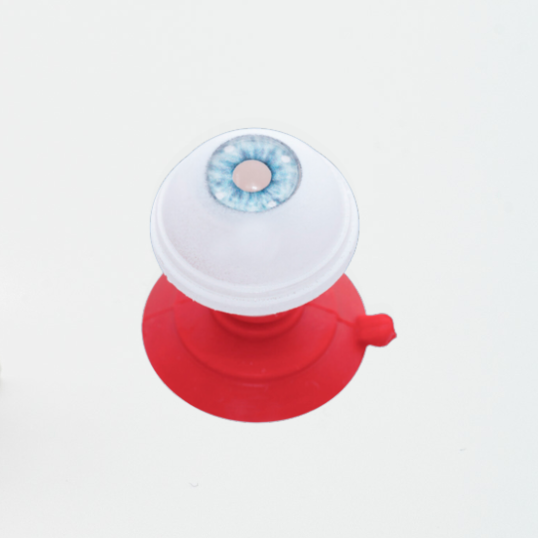 This model provides a cornea-scleral shell for use with or without an iridotomy lens. Inside is an iris with 4 treatment areas. Multiple laser spots need to be delivered in focus in order to break through the iris and create the PI. A red reflex is visible with retro-illumination upon completion of a successful PI. Realistic laser power settings are utilized. The model needs to be filled with water prior to use. An iridotomy laser lens may be used with Goniosol or other gels as a coupling agent for visualization. This model is considered single-use. However, multiple laser spots can be applied to each eye before it is consumed.